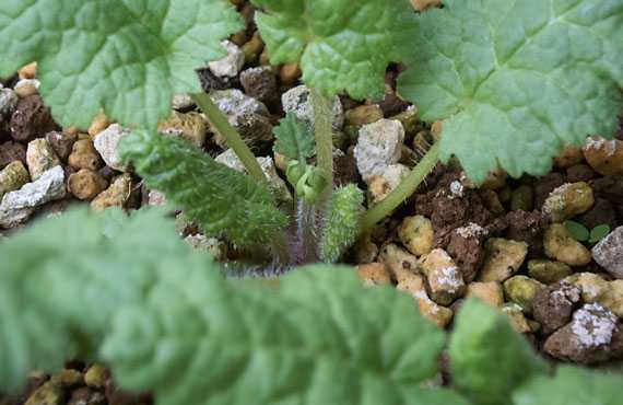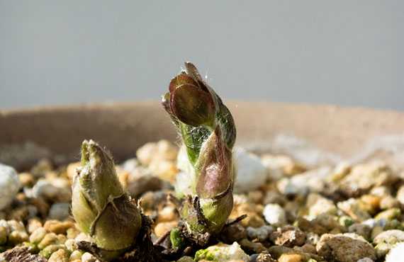 日本サクラソウ「南京小桜」の花芽が姿を見せました。昨日時点で視認できたのはこの1株だけですが、さほど日にちを開けずに後続も動き始めることと思います。 日本サクラソウの仲間は、この状態から開花まで20日ほどかかります。この助走期間を今年に当てはめれば、開花は4月早々になりそう、という予想になります。この予想通りなら、ほぼ平年並みと言えます。例外的に4月末まで開花日がずれ込んだ年もありますが、この年はツボミの発生から遅れており、ツボミを準備した後は大きな番狂わせは殆どありません。
