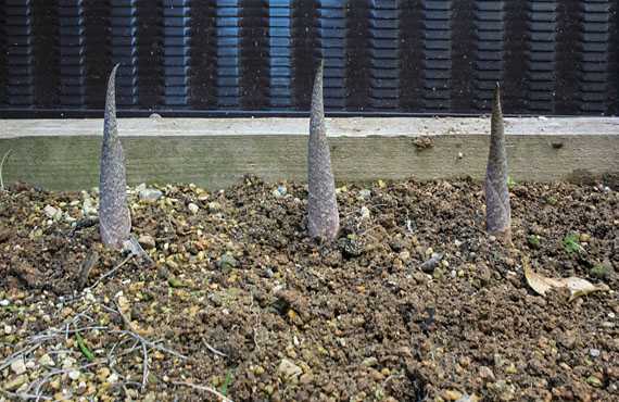5日間続いた開花リレー(?)が途切れてしまいました。ということで今回はやや”見飽き”感が否めない芽出しネタに戻ります。画像は露地植えのムサシアブミ(武蔵鐙)です。本当は1週間ほど前に芽出しが始まっていたのかもしれませんが、頭上を雑草に覆われていて発見が遅れてしまい、こんな無様な紹介になってしまいました。いやはやお恥ずかしいことで・・・・ 昨年秋に土佐文旦の根元から、1mほど離れた位置に移植しました。何度かこの場で紹介しましたが、花壇全域に濃厚な肥料が行き渡っており、植え替えなどの少々のストレスは物ともせず、大きな図体を維持しています。この点はポット栽培の他の3品(マムシグサ、ウラシマソウ、ユキモチソウ)とは大違いで断然有利な条件です。この3個体の内、この秋を目途に少なくとも1点は自然に還そうと思っています。