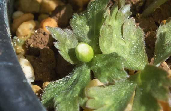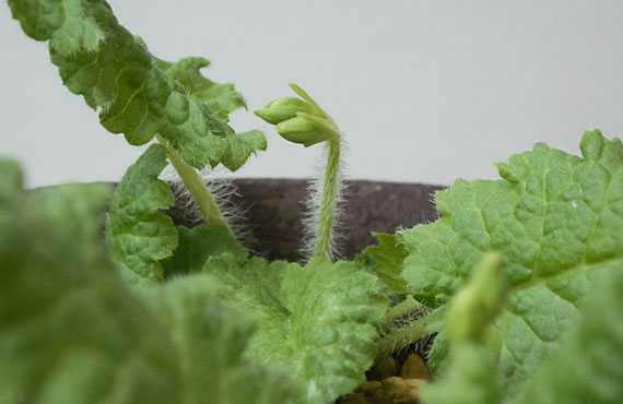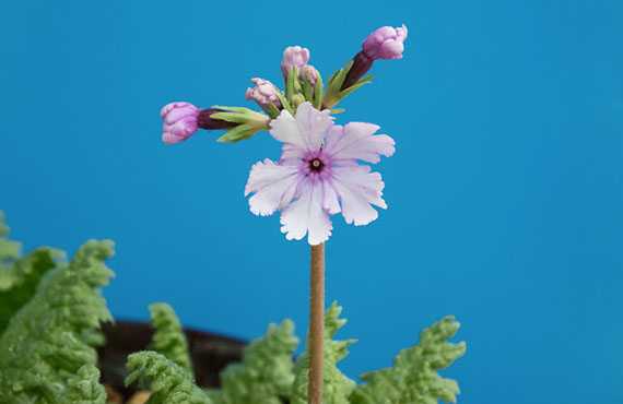 日本サクラソウの手持ち全品種が花芽を出して臨戦(?)体制に入りました。画像は「青葉の笛」という銘を持つものですが、昨年の開花時重大な欠陥を見つけてしまいました。 本来「青葉の笛」というのは純白の花弁に淡い緑の絞り模様が入るのですが、昨年春の開花期、花の半数以上が単純な純白品でした。キチンと絞り模様が入ったのは1輪だけだった様に記憶しています。恐らく種苗会社で種子を採った段階で、いろいろな品種の交雑が進み、絞り模様が入るものや入らないものがごちゃ混ぜになったのが原因ではないかと推測しています。今年は開花した個体ごとに「青葉の笛」とそうでないものに分類するという仕事が待っています。「そうでないもの」も純白の美麗品であって、粗雑に扱うことはあり得ませんが、両者をキチンと分けて管理する上で、そのプロセスは重要だと思っています。