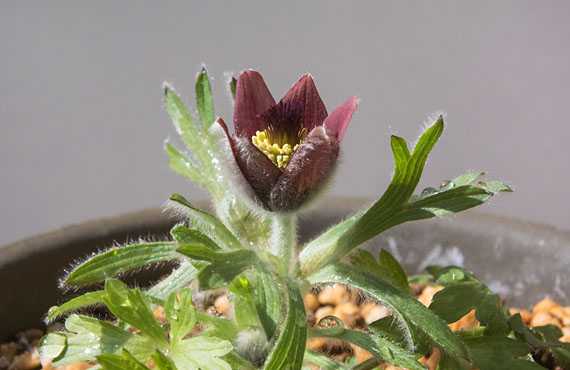 日本オキナグサが開花しました。開花から間もない撮影のため、この品種特有の120度超の最敬礼級お辞儀には至っておりませんが、さほど日を置かずにそうした姿勢に変わることと思います。 この品種はワタクシが山野草と同居を始めた原点に当たるものです。以来10数年繁茂と全滅を幾度か繰り返しつつも悪縁は続いています。小庭からこの品種が消えると、我が顔から鼻や眉毛がなくなった様な寂しさに包まれてしまい、条件反射の様に代替品を探してしまいます。取り敢えず今は、顔の全部品が揃った形で平穏な日々が続いていますが、それもこの個体のお陰かもしれません。