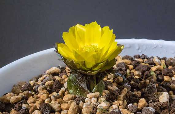 福寿草の「福寿海」が開花しました。昨年と比べてざっと3週間の遅れですが、この冬の寒さを思えば「さもありなん」ということでしょう。 一昨日覗いた時点では、ツボミは固く閉じていたので、開花は2-3日先だろうと思っていたのですが、日付が変わってみると予想外に暖かかったことから慌てて開花して見せたといった眺めです。現時点では胴(茎)も首(花柄)も全く伸びていない状態で、花を表土の上に投げ出した様な眺めで、まるで”晒し首”状態ですが、今週末頃には胴ももう少し伸びて、更には2番花、三番花も参戦して賑わいを演じてくれることだろうと思います。