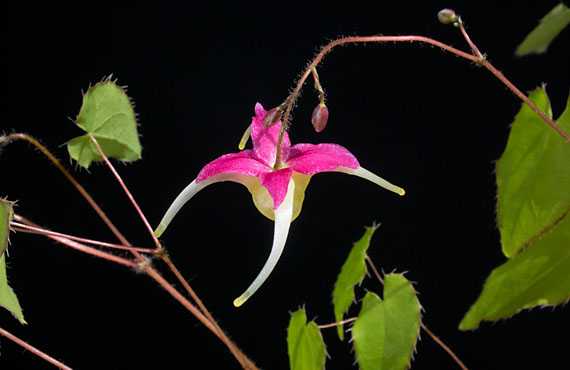 春の開花ラッシュも盛りを迎え、イカリソウもこれに参戦しました。一番乗りしたのは今年も「楊貴妃」でした。昨年より21日早い開花です。例年だとこの品種が出番を迎える頃には、雪割草は殆ど花を終えているのですが、今年の雪割草は6割ほどが未開花です。事程左様に今年の花(注:山野草に限る)の咲き時は、極端にぶれる傾向が見られます。 さて本題の「楊貴妃」ですが、今年の1番花も中々の美形です。赤い萼片と淡い黄色の流れる様な”距”を同時に捉えられるのはこの角度がベストだとワタクシは考えています。人間をこうして眺めてしまうと、痴漢、変態扱いされるのが避けられませんが、花子さん達に対してはお許し願いたいものです。