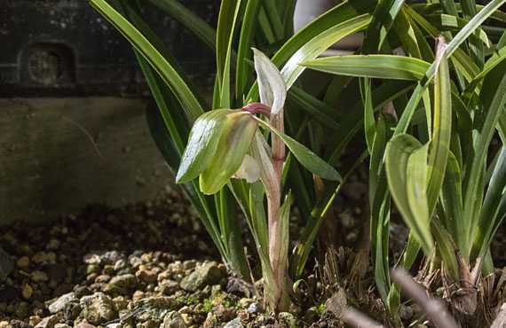 昨年の8月から冷温庫で低温保存していたサワラン(沢蘭)を、ぼちぼち取り出して定植しようか、ということで取り出してみました。上画像が冷温器収納時の装備、円内が収納していたバルブを取り出した状態です。既に芽出しが始まっており、あと1週間も取出しが遅れたら、修復不可能な状態まで伸びていたかもしれません。そうした”もしも”論議は一旦横に置いて、まずはこれを所定の住まい(5号陶鉢)に定植することにします。 結論として、植え付けを済ませた様子が下画像です。培地は裁断したミズゴケと、たまたま残っていた種蒔き用配合済み用土をほぼ1:1で混合したものです。一般的にミズゴケ単用での植え付けが推奨されていますが、我が家ではダンゴムシやナメクジがミズゴケの隙間に住み着き、地中、地上を問わず食い散らかす被害が絶えず、こうしたイレギュラーは植え付け方法を採っています。