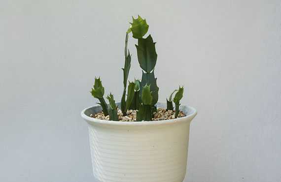 この2-3年、シャコバサボテンの不作が続いていますが、この原因の1つが株の老化ではないかと見当を付け、全面的な若返りを図ることにしました。紅白2品ある内、まずは赤花品から着手します。 新株は差し芽で増やしたものです。今シーズン1輪のみ咲いた花が終った2月中旬に差し芽を行い、既に発根したことが確認できているものです。6号プラ鉢の中央部に3段構成の個体3株、その外側に2段構成の6株を円形に植え付けた状態が上画像です。次のシーズンまでに各個体とも更に2段から3段上積みしそうですが、このポットに関しては枝分かれや段重ねに一定の規制を加えることになります。そのために、無用な枝分かれには芽欠きも行い、花のシーズンに適正な樹形となることを目指すことになります。