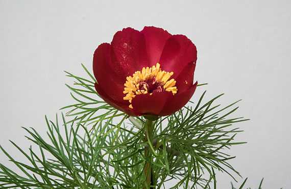 赤花糸葉ヤマシャクヤクが開花しました。昨年と比べて3日遅れの開花ですが、この程度は誤差の範囲内ということにします。この花が日差しを受けるとメタリックかと思わせる光沢感があるのですが、いざ、写真にしてみると、これが上手く表現できないまま10年ほどが過ぎてしまいました。昨日は生憎の雨模様で、この光沢感にも見放されてしまいました。 年毎に1株、また1株と数を減らし、今ではこのポットの他には病み上がりのもう1株だけという寂しいことになってしまいました。今年はこの花1輪だけですが、何とか自家受粉で種子を実らせて貰わなくてはいけません。種子からだと花が咲くまで7~9年かかりますが、何としても全滅は避けたい品種の1つです。
