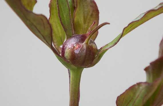詳細不明のシャクヤク(芍薬)がツボミを付けました。タネを蒔いて凡そ7年が経過しています。現行品の白花重弁ヤマシャクヤクや赤花糸葉ヤマシャクヤクも種蒔きから8~9年かかったので、この品種がこの年数なら概ね妥当な線か、などと勝手に納得しています。 この品種は祖父が大切に育てていたものですが、品種名などは全く分かっていません。花を最後に見てから既に半世紀が経過してしまい、花の色や姿は全く思い出せません。今では”謎”になりかけた花が、間もなく解明できるか・・・という段階に漕ぎ着けた訳で、1ヶ月ほど先の開花が待たれます。