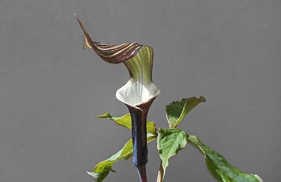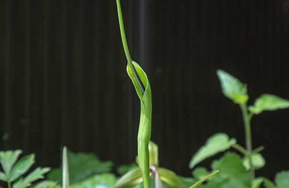 不気味四天王の一角、ウラシマソウ(浦島草)が店開きしました。これまた前年と同じ日の店開きでした。この1週間ほど、前年と同日開花・開店が続きましたが、だからと言ってこの先開花時期の大幅なズレ幅が縮まるという訳ではなさそうです。 ウラシマソウという呼び方は浦島太郎から来ていると言われています。仏炎苞の開口部から伸び出しているひも状の構造物を釣り糸に見立てての発想の様ですが、画像の個体でひもの長さを計ってみると36cmありました。仏炎苞の丈のざっと3倍です。この個体は過剰な分球から2年経った状態で、まだまだ若輩者の段階です。山地に自生する古参株などでは70~80cmに達するものも珍しくありません。藤原岳(鈴鹿山系)ではこの品種の大きな群落が見られますが、例年なら5月初めには見頃を迎えます。