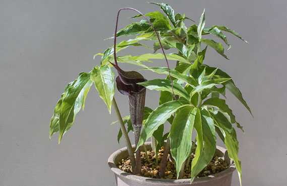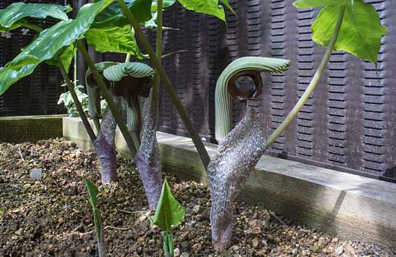 不気味四天王の一角、マムシグサ(蝮草)が仏炎苞を展開しました。5年遡っても店開きの記録が見つからない、という程の長い長いトンネルでした。よくもまあ、全滅を免れたもので、余程の強運か生命力の持ち主という他ありません。同じ不気味族の1つ、ユキモチソウが現在同じ道を歩きつつあり、この品種が辿った道を振り返りつつ、リカバリーのプロセス短縮に生かして行くきたいと思っています。