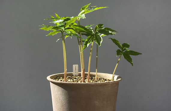 不気味四天王の一角、ユキモチソウ(雪餅草)が今年は作落ち確定です。昨年の内に地中の”芋”が四分五裂の惨禍に見舞われた様で、ご覧の通りの幼稚園児級の子株ばかりになってしまいました。合計7株あります。これでは仏炎苞など望むべくもありません。 この先、1年でも早く仏炎苞を生成して貰うためにすぐにでも植え替えを行わなくてはいけません。この7株の中から1点を選抜してポットに残し、他は露地に転居させます。ポット株には有機肥料、化成肥料を十分に施し、生育の加速を目指します。来年は無理としても、その次には仏炎苞に再会できることを願いつつ、成長を後押しするつもりです。