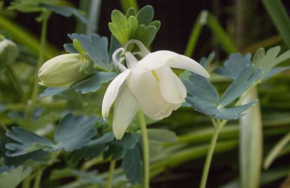 白花ミヤマオダマキ(深山苧環)が開花しました。昨年より10日早い開花です。生憎のどんよりと曇った条件下の撮影になり、画像としてはメリハリに欠けるものになってしまいましたが、花期は比較的長いので機会を改めてベストショットにトライすることにします。 10日ほど前、紫花のミヤマオダマキには古参株が存在しない旨紹介しましたが、上の画像の個体は5~6年、或いはそれ以上の古参株です。ごく近い品種同士で、こうした差異が生じる理由もよく分かっていませんが、1個体のご長寿であれ、世代交代の積み重ねであれ、品種の断絶さえ起きなければ取り敢えず”良し”ということにしておきます。