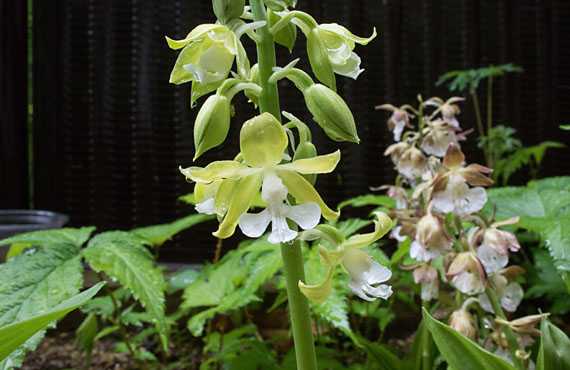地エビネの黄花品が開花しました。昨年と比べて2日早い開花ですが、この程度の差は「有意差なし」とします。雨中の開花で雨粒まみれの上、輝点も影もない立体感に欠ける画像になってしまいましたが、そこはお目こぼしを .... 背後右手に茶花品がボンヤリと写り込んでいます。これらの地エビネが我が家にやって来て4~5年が経ちました。この間、茶花品は花芽が1芽だけだったものが5芽まで増えましたが、黄花は未だに1芽だけです。厳密に言うと、この1芽に寄り添う様に芽吹いた小さいものが1芽不随していますが、花を咲かせる様になるには2~3年かかりそうな雰囲気です。ことほど左様に増殖力では見劣りしますが、どことなく漂う花の上品さに座布団1枚、と言いたいところです。