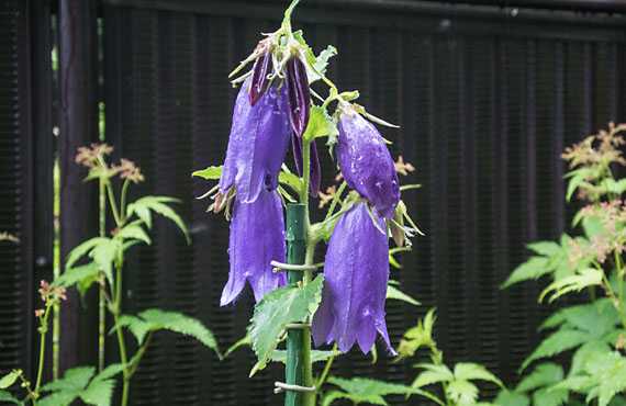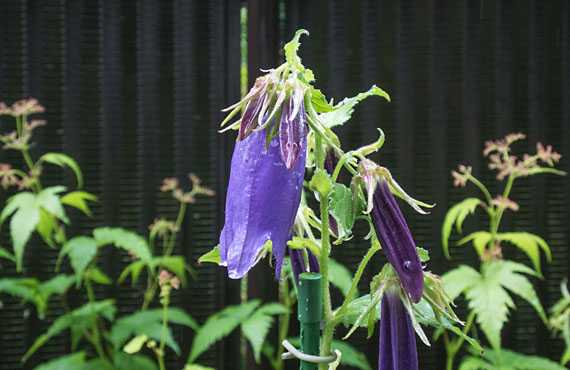 青花ホタルブクロの1番花が開花して1日、いきなり花のピーク期が来てしまいました。今年の開花見通しは画像の株だけで8割ほどを占める見込みで、この株が峠を越せば、事実上この品種の幕は下りることになります。つまり画像に写っているツボミ4個を使い切り次第「ジ・エンド」ということになり、後になって振り返ると「今年の青花はあっさり終わったなあ」ということになりそうです。 天気が良ければレフ板も取り出して、「あーでもない、こうでもない」という風に大騒動の撮影風景が繰り広げられるのですが、雨ではレフ版は無用の長物です。透明のビニール傘に隠れる様にカメラを向けるのが精一杯の敬意の表明というところで、この先1週間は状況の好転は期待薄です。