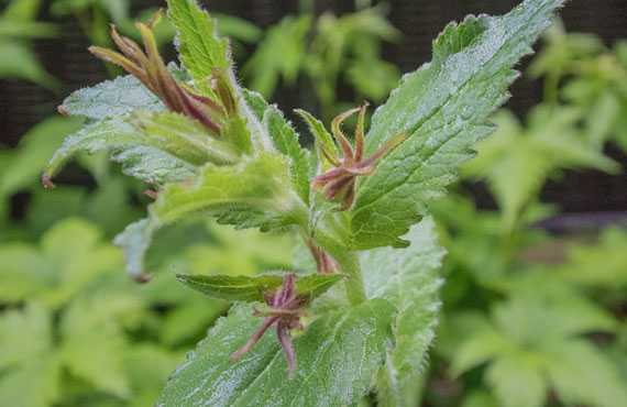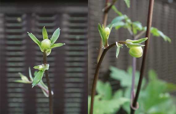 レンゲショウマ(蓮華升麻)のツボミが姿を現しました。この状態から開花まで、ザックリ言って50日余りかかります。乱暴な予想になりますが、この実績を当てはめれば、今年は7月中旬開花・・・となります。但し、その前に越えなくてはならない大きな難関が待ち構えてています。 その難関というのは”食害”で、毎年少なからぬ量のツボミが盗賊どもの腹に消えています。よく出る毛虫やバッタ、イナゴなどは、花のツボミに食指を伸ばすことはなく、専ら葉っぱを喰っていますが、ナメクジだけは高所に登ってツボミや開花した花を襲撃することがあります。犯行は夜間のことなので、現場を押さえた訳ではありませんが、特有の痕跡からヤツ等の犯行と断定しています。ツボミの方は開花までの助走期間の後半は、最外周の萼片を硬化させて防衛していますが、前半は萼片も柔らかで、賊どもには喰い頃と映るのかもしれません。今年は梅雨入りが早かったことで、既にナメクジの活動が活発化しているのが確認されており、被害の拡大が懸念されます。