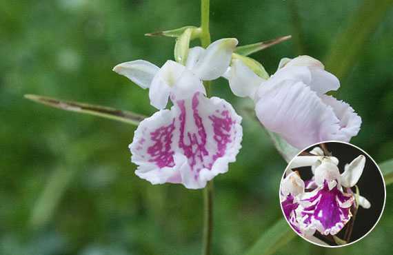 2個1セットで調達したウチョウランの内、遅れていた2番手が開花しました。1番手(円内)から2週間遅れた勘定になります。この遅れが花にとっては幸運だった様で、花弁や萼弁の低温障害は軽微で、アップで観察しても気にならない程度に留まっています。 商品として品種や銘についての説明は何もなく、これらは同一品種として扱われたものと推測できますが、舌弁の模様に代表される”顔立ち”はかなり違って見えます。この先、この顔立ちの違いは同一品種内の個性差として扱いますが、両者を識別する上での必要性から、先行開花品を「1番」、今回開花したものを「2番」と仮命名して管理して行くことにします。