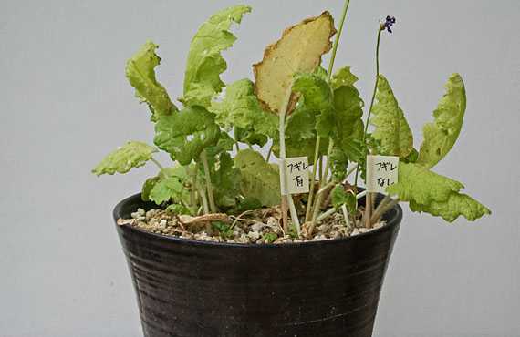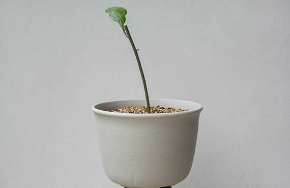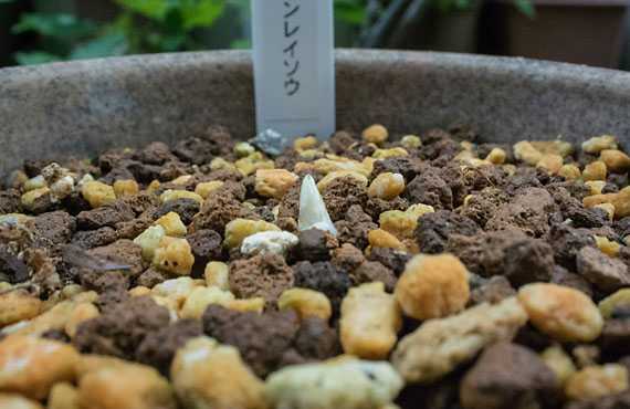昨年夏から今年の冬を冷温庫で低温保存していた大花エンレイソウでしたが、冷却機構の不調で庫内温度が上昇してしまい、春先2月に取り出した時には30cmを超えるほどに芽が伸びていました。これではリスタートは期待はできそうにない、ということでほぼ諦める一方で、万に一つの奇跡に賭けて通常と同じ用土と肥料でポットに埋めていました。暖かくなっても3ヶ月は何の変化も見せませんでしたが、昨日巡回していてポットの中央に芽が出ているのを見つけました。殆ど諦めていた品種だけに感激はひとしおです。 とは言っても、1年で2回の芽出しをして、スタミナは底を突いている筈です。この先、自身を太らせるには、精一杯の光合成で養分を作り出す外はありません。同時並行で来年に向けての養分も蓄えなくてはならず、病み上がりのこの個体には荷は重過ぎる様にも見えます。しかも北方系、高山系のこの品種に、ここ神戸の気候は厳し過ぎます。等々、生き延びられる可能性は、針の穴に箸を通す様なものですが、最大限の便宜を供与してサポートするつもりです。