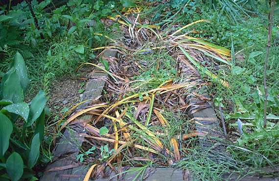 いつもより早いかな?・・という印象ですが、リコリス群が就労期間を終え、休眠期間に入りました。既に葉っぱは枯れて、ほぼ全量が地面に横たわってしまいました。このまま放置しても半月もすれば全てが土に返るのですが、その半月の腐敗過程がたまらなく汚いので、雨の止み間に乗じて一気に片付けることにしました。 作業の内容は横たわった枯葉の根元を園芸バサミで切り離し、火ばさみで摘まんで撤去するだけです。片付けた葉殻は1か所にまとめておけば堆肥になるのですが、今年はそれも止めて燃えるゴミとして処分することにしました。下がAfter画像で、かなりスッキリしました。4つの区画に分かれていますが、手前から順に「真夏のクリスマス」(白花)、「さつま美人」(ピンク花)、「山の根ゴールド」(黄花)、「アルビ・フローラ」(白花)を植え付けています。このエリアの品種はいずれも早咲きで、8月下旬から咲き始めます。