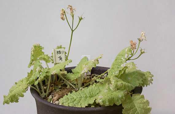 日本サクラソウの「青葉の笛」が咲いていた頃、正常品(緑の絞り模様有り)と非正常品(絞り模様無し=単純白花)をマーキングして区別していました。今年、”正常品”と認定できたのは、開花数が少なかったせいもあって僅かに1個体だけでした(上画像中央やや左の個体)。右に傾いたのは絞りのない単純白花品です。その他の個体は、今年の花期にはどちらとも判定が付かなかったものです。まずは”正常品”を分けて管理するために、別のポットに移植することにしました。非正常品と未判定品は、現状のポットで来年まで過ごして貰います。 ターゲットの個体は、塊根の周りの用土を竹串で崩しながら、極力ヒゲ根を傷めない様に注意しながら掘り上げます。掘り進めていて、今年花を付けた塊根から新芽が分岐しているのが確認できました。大きなアクシデントがなければ、秋までに少なくとも2株に増える筈です。転居先として用意したポットは3.5号の陶鉢です。いつもの配合比の用土に緩効性、即効性の肥料を適量まぜたもので植え付け、「一丁上がり」としました。既に日差しは夏場に近い強さになっています。新しい用土に馴染むまで、暫く日影の屋内で過ごさせることにします。