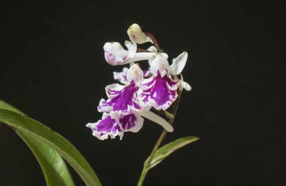 ウチョウラン(羽蝶蘭)が見頃です。この品の1番花が開花したのは4/21でした。生憎1番花はツボミの時期に軽い凍傷を負い、花弁、萼弁のあちこちが茶色く変色してしまい、この場での紹介を自粛してしまいました。今咲いている個体も、つぶさに見ると少なからず変色部分が散見されますが、少し離れれば苦にならない程度の障害なので、改めて取り上げることにしました。 この品の経過を整理してみると、HCの園芸コーナーでリクルートしたのが1月下旬でした。即日定植しましたが、寒の底で屋外に出す訳にもいかず、比較的室温が上がり難い洗面所に置いていたところ、2/8には芽を出し始めてしまいました。益々屋外への移動は難しくなりツボミが発生した後の4月に入って屋外に出しました。ぬくぬくと室内で育てたのが裏目に出た様で、短期間でツボミが黄変する障害が出始めてしまい、これが開花後も目立つことになってしまいました。こんな具合で今年は花を台無しにしてしまいましたが、次のシーズンにはもう少し上手く咲かせる様工夫してみます。