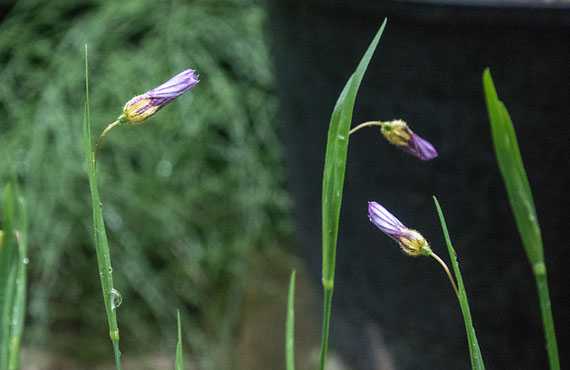 ニワゼキショウの1番花開花から3日が経過しました。昨日の朝には開花数も増加して合計10輪が開いていましたが、昼頃から雨が降り始めると画像の様に花弁を閉じて閉店休業体制に入ってしまいました。”晴耕雨読”ではありませんが、晴れたら働き、降ったら寝る・・・という風な、奔放な(適当に怠ける・・・という意味で)生活スタイルを身につけた様です。さもありなん。この品種の様に上に向かって花弁を開く花が、雨に日に花を開いていたら花粉が水浸しになってしまいます。結果、受粉もできなくなり、ひいては子孫へのつなぎ役となる種子も結べなくなってしまいます。適当に怠けている様に見えて、実は最も安全な生存方法を身に付けたのかもしれません。