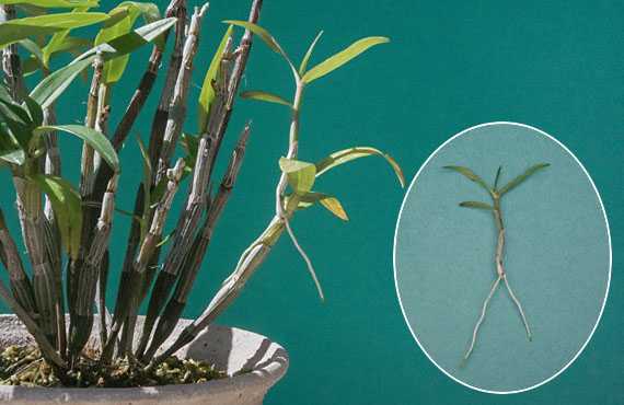 5月に調達した赤花セッコク「雷山」が、茎の先端部で枝分かれし、その枝が根を伸ばし始めました。2又に分かれた根はぐんぐん伸びて、茎の丈を上回る様になりました。この子株は、今はまだ親株から養分を貰っている様ですが、いつかはその供給も途絶える筈です。それまでにこの根が培地に届けば命は繋げるのですが、間に合わなければ一巻の終り、ということになってしまいます。 ということで、先手を打って子株を親株から切り離し、自分の根で生き延びられる様、所定の培地に定植することにしました。円内が切り離した子株です。これを別途用意した2号陶鉢に植え付けます。培地は微粒赤玉土と裁断したミズゴケを半々に混ぜたものです。下画像が植え付けを済ました状態です。ヒゲ根2本だけでは屋外の高温乾燥の環境では生存困難ということで、この夏から冬は屋内で過ごさせることにします。