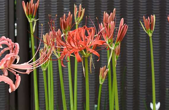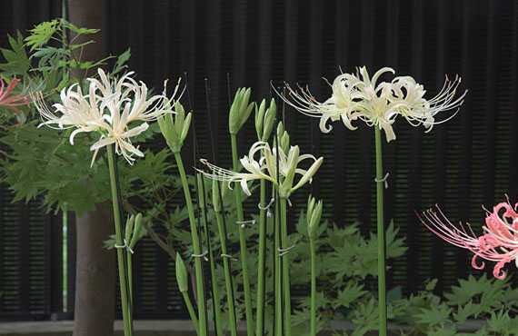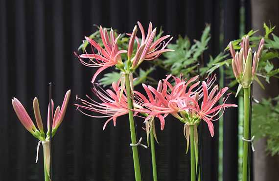台風14号は事前の予想よりかなり南寄りのコースを辿って通り過ぎました。お陰で我が家での、風による被害は全くありませんでした。 画像は昨日夕方の撮影ですが、全員起立で記念撮影できました(背筋ピンの矯正はしています)。画像で左手前のピンク花の「さつま美人」が満開、同・奥の「アルビ・フローラ」が九分咲き、画像・右のヒガンバナ・白が八分裂きといったところです。サクラの場合は八分咲きに達したところで満開宣言を発するそうなので、我が家のリコリス3品種記念撮影も「満開」での撮影としておきます。何はともあれ、台風がらみの危機は回避できたことで、ヒガンバナ・赤を含む4品種の揃い踏みも望み得る状態が維持できた訳で、”めでたし”の1語に尽きます。その赤花は、早ければ今日にも開花しそうです。