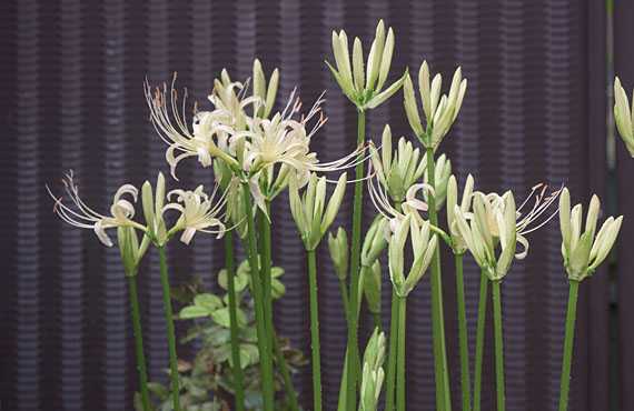 ヒガンバナの白花品も開花しました。昨日と同じ理由で前年比較は出せません。昨日取り上げたアルビ・フローラとは、例年なら1週間ほど開くのですが、今年は1日違い・・・ということは殆ど丸カブリになりそうです。そんな些細なことより、今はスーパーな危機が足音を響かせて近付きつつあります。そう。台風14号です。下手をすると、ここに並んだ20株ほどが夕方には全員枕を並べて横たわる、などという事態もありそうな雲行きです。峠は間もなく過ぎそうですが、何とか昼まで持ち応えれば、と祈る気持ちで見守る他ありません。