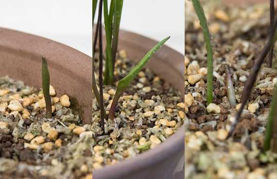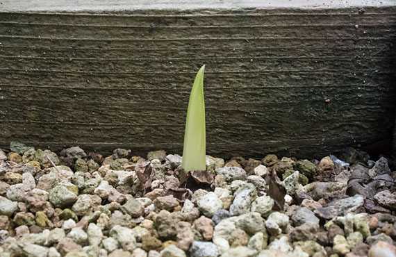 八重咲スイセンが新年度の活動を開始しました。過去と比べてどうなのか・・・については、この件に関しての記録が全く残っておらず評価できません。ということで、今年から記録をしっかり残して、来年以降はキチンと評価できる様にしたいと思います。 5月に入った頃から少しずつ葉を枯らし始め、6月には完全に地上部は姿を消していました。ほぼ3ヶ月、暑さを避けてしっかり眠ったことになります。同様に夏場に休眠する他の品種と比べてみると、ネジバナが1ヶ月弱、リコリスの仲間が2~3ヶ月という風な数字になっています。スイセン類のこの先の仕事の流れは2ヶ月ほどかけて葉っぱを充実させ、早ければ11月中旬には花芽を出し始めます。1番花開花は早い年は12月、遅い年は1月までずれ込むこともあります。