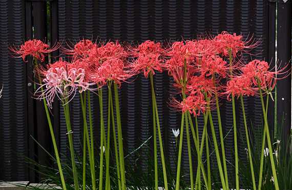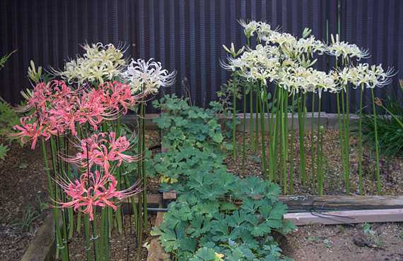 1番花の開花から2日経って、ヒガンバナが満開になりました。3日先行して咲き始めた同・白花品も今がピークで、紅白まんじゅうの様に両者隣り合って豪華な眺めを演出してくれています。赤白を混植しては?、という指摘を頂いたこともありますが、今は主に白花品になりますが、7~8月の休眠期に球根を掘り上げて里子に出す際、混植してしまうと個体識別ができなくなります。そんな訳で、もう暫くはこの状態を維持するつもりです。
