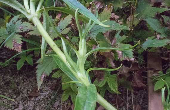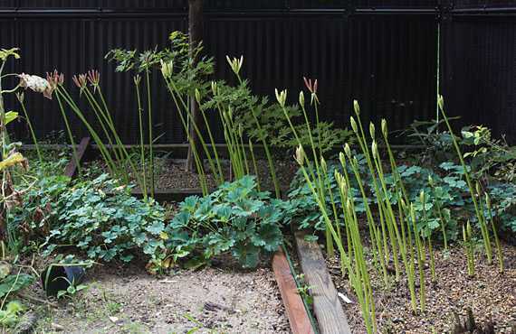 ピンク花リコリスの「さつま美人」と白花の「アルビフローラ」の開花が近付いて来ました。花軸は30~40cmまで伸びましたが、残念なことに日差しを追いかけて首を傾げたまま固まろうとしています。このままでは花が咲いても甚だ見苦しいので、花軸に添え木を当てて背筋をピンと伸ばした状態を実現することにしました。 画像中段よりやや手前(下)に緑の葉が一列に並んでいますが、その線より手前側はヒガンバナの白花品です(少数の混入品有り)。それより奥が開花の迫った「さつま美人」と「アルビフローラ」です。画像上で左1/3の赤みを帯びたものが「さつま美人」、中央部1/3が「アルビフローラ」になります。今回は「さつま美人」に「対して添え木・・・と言っても2.5mm径のアルミ線を当てて、姿勢を正すことになります。こちらが作業を終えた様子です。幾分先端に向かって広がっているのは、こうしておかないと花と花が絡んで大変なことになるためです。この時間帯には、霧雨の様な雨が降り続いていて長時間の作業はできず、「さつま美人」の9株を処理したところで切り上げてしまいました。残りは今日にも片付けることにします。