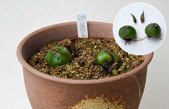 早ければ昨日の内に開花するかも・・・などと予想した在来型のヒガンバナは、残念ながら昨日は変化は起きませんでした。ということで、今回紹介するのは大輪トキソウのバルブの撤収です。8月下旬には全ての葉っぱが枯れていましたが、撤収はズルズルと遅れていました。 いつもの要領で培地からバルブを掘り上げ、簡単に水洗いした様子が円内です。大きいものでやや小さめの梅干しほどで、このサイズなら来年春の花付きは大丈夫かと思います。小さいものは”柿の種”ほどのサイズで、開花サイズまで相当な修行が必要です。この春先に購入した時点では大バルブ2個だったので、この小球2個がこの1年の成長の結果ということになります。これをいつも通り水を含ませたミズゴケに包んでポリ容器に納めて、低温にセットしたモバイル冷蔵庫に直行しました。立春の頃に取り出して、通常の培地に植え付けることにします。