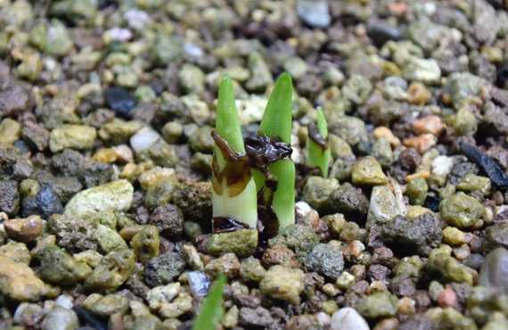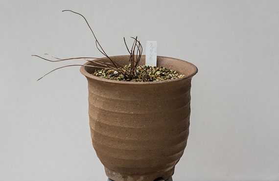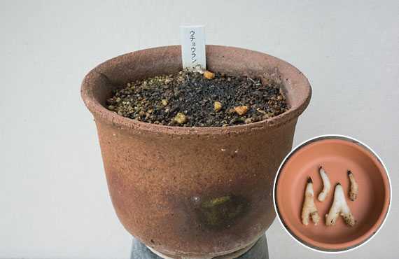 7年がかりで育てて来た濃色赤花ヤマシャクヤクが、今年初花を咲かせたことは、今年の数ある開花ニュースの中でも、最も強く印象に残っています。上画像がその時の様子で、山野草専門店で販売されている赤花ヤマシャクヤクが淡いピンクであるのと比べて、発色はかなり濃く出ています。 その濃色品も8月に種子を成熟させた後、早々と地上部を枯らせてしまいました。で、今回はこのヤマシャクヤクを概ね4年ぶりに植え替えることにしました。6号プラ鉢に2個体が植わっているのですが、4年、或いはそれ以上に亘る放置プレイにふて腐れたかのように、塊根は複雑に絡み合ってしまい、分離にはかなり梃子摺ってしまいました。それでも何とか大きなダメージもなく分離し、新たな5号陶鉢に植え付けた様子がこちらです。予想以上に塊根は大きく育っていて、用意していた5号ポットでは1年持たせるのが限界かもしれません。