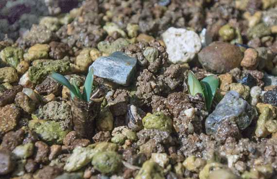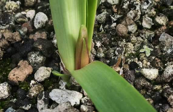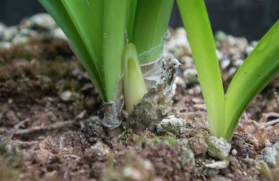 原種ネリネ(無銘)でも花芽が顔を出しました。昨年と比べて5日遅れの始動です。一足早く始動した類似種の「Rosea」と比べると4日遅れということになります。この2品種は、花芽始動の順序がそのまま開花の順序となる確率が高く、こちらの開花は11月下旬の後半となりそうです。 この品を植え付けたプランタは、球根の成長に伴う用土のせり上がりが顕著な上に、表土に着生したコケも厚みを増して、表土はプランタの端面を超えてしまっています。見た目に”美しい”とは言い難い有様で、遠くない時期に植え替えが必要なことは明白なのですが、さて、それをいつ実行するかが問題です。花後の実施が開花への影響がない点で最良ですが、その頃には葉っぱが伸び切って扱いが面倒だし、時期は大寒の頃になってしまい怠惰なワタクシには越えられない壁になります。それに対して、今植え替えを行えば寒さの壁はありませんが、植え替えのストレスはツボミの成長に何某かの影響を及ぼすことが避けられません。植替えをいつにするか、悩ましい宿題です。