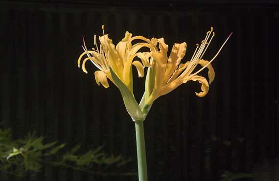 我が家で保有するリコリスの中で最晩生に当たる黄花品、《ジャイアント・イエロー》が開花しました。昨年と比べて14日早い開花です。《ジャイアント・イエロー》というのは我が家だけで通じる仮名称で、花の差し渡し径を始め、が体が他と比べて図抜けて大きいことに起因しています。1番花は個々の花が斜め上方に傾いているため、全開しても20cmに届くかどうか微妙です。 昨日時点で花芽は4本が立ち上がっています。今年は株数(=球根数)が20株を越えたことから、花芽10本以上を期待していたのですが、未達に終わりそうな雰囲気が日に日に濃厚になりつつあります(涙)。