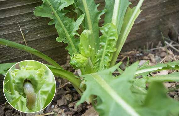 白花タンポポのツボミは3番手まで顔を揃えてきました。その内の1番、2番はタンポポでは滅多に現れない「一軸二花」でした。これを気付いたのは一昨日のことです。 1日経って、昨日覗いてみると、二花の内の片方に賊が侵入しているではありませんか。それもツボミの先端に穴を開けて、上半身をツボミの中に入り込んで貪り食っているではありませんか(円内)。瞬間湯沸器モードで怒りが走り、即刻”キ●チョール一吹きの刑”に処してしまいました。 この様な喰われ方では、最早”花”として真っ当に開花することは期待できません。初めての”一軸二花”も実現せずに終わってしまった様です。いと悔し・・・・