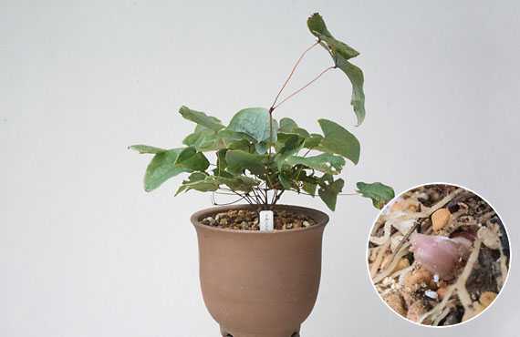 植替えの度に思い立っては見送って来た”株分け”に今年もトライしました。過去には何度も同じ場面に遭遇しましたが、この品種の特異体質の様なものを理解していなかった昔は別にして、実行に踏み切れたことはまだありません。”特異体質の様なもの”とは、冬芽を持たない塊根は必ず腐敗・枯死する、というものです。 そうした事情を背景に地中の塊根を掘り上げました。塊根は「一寸先も見えない地中で、よくもまあ、こんなに器用に絡み合えたもんだ」という風な溜息混じりの愚痴が漏れるほどに、複雑に絡み合っていました。それでも、何とか冬芽と塊根がセットで切り離せるポイントを見付け、切り離した状態がこちらです。 双方の塊根の切り口に消毒・防腐剤を塗布して、新しい用土で植え付けを済ませました。大きい方が6号、小さい方が5号のプラ鉢です。5号ポットとなったのは、単純に6号が弾切れしただけで、他の意味はありません。塊根とヒゲ根のサイズから判断して1年程度は凌げるだろう・・・というのが本音で、無事に定着すれば来秋も植替えは不可避です。