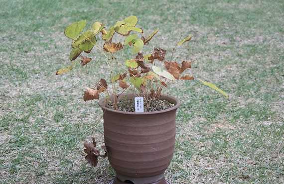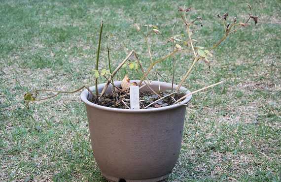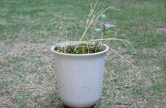 この春花を付けなかったイカリソウです。タイミングとしては昨年植替えが必要でしたが、建屋の大規模修繕に伴う制約で見送ってしまいました。それを根に持っての作落ちではないのでしょうが、この秋は植替えは必須です。ということで、来春こそ・・・という催促の意味も込めて用土を更新し、生活環境を改善することにしました。 株を掘り上げてみると2年半の放置プレーに的確に反応して根はかなり回って、根っこ玉に近い状態を呈していました。これを竹串でしごいて、網の目状の根の絡み合いを幾分かは解しました。表土付近では来春に向けて小豆粒大の冬芽が準備されており(円内)、これなら来年の花付きは間違いなかろうと期待は膨らみます。新居はこれまでより僅かに大きめの陶鉢を用意しましたが、このサイズ差(0.5号相当)は誤差の様なものです。新しい用土に適量の化成肥料、有機肥料を梳き込んで植え付けた様子がこちらです。尚、時期的に大量の葉っぱはもう必要なかろうということで、概ね半量を狩り払い身軽にしてしまいました。来年は頼むよっ!!
