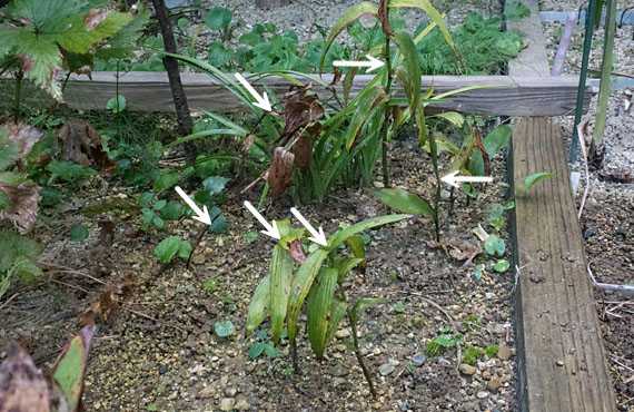 今回紹介するのは数年に1回あるかないかのレアケースの植替えです。画像は我が家の野草園の一角ですが、ここに植え付けているカキラン(矢印を付した6個体)は周囲の他の品種との相性が悪いのか、この3年花を咲かせるのを忘れています。相性問題というのが当たっているかどうかを確かめる目的で、露地ものをポットに戻してみることにしました。 こちらが右上に写った2個体を掘り上げた様子ですが、ポットから露地に植え替えた時と比べて大きな変化は感じられません。来年に向けての冬芽は既に準備されており、やる気はまだ残っている様です。これを6.5号陶鉢に植え付けて作業は終えました。早ければ来春、遅くとも再来年までに花を見せてくれれば、栽培方法を再転換・・・という流れになるのですが、さて、どんなことになるやら ....