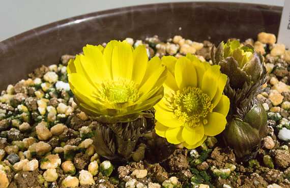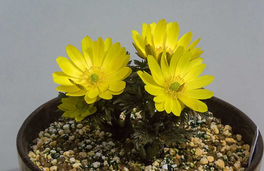 福寿草の「福寿海」が見頃を迎えました。・・・と言ってしまうと少々事実に反してしまいます。というのは4-5日前にはこれに近い状況には達していましたが、気温が低いため日中でも花が半開き状態を超えることがありませんでした。寒さはまだ完全に去った訳ではありませんが、昨日は風がやんだことで、そうした寒さも幾分和らいだのを受けて、3輪揃っての全開が実現したものと思われます。 この週末から暫くの間は暖かい日が続く、との予報が出されています。そうなるとこの品も、葉陰に隠れているツボミが順次開花して、一層豪華さを増すものと思いまいます。大きな変化があれば続報を掲載します。