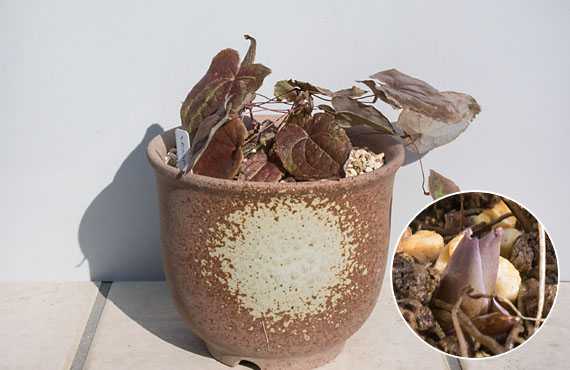 本来なら深い休眠に入っている筈の在来型イカリソウなのですが、この冬はどうしたことか葉を茂らせたまま春を迎えようとしています。当初は常緑型の黄花イカリソウと取り違えたか、などと勘違いしていたこともありましたが、黄花イカリソウを棚卸ししてみると、秋の手入れの時の鉢数は揃っており、取り違えはなかったことが確認できました。 それはそれでメデタイことですが、だったらこの越冬してしまった方はどうなるか、気になりつつ間もなく春・・・と言っても良さそうな時期を迎えてしまいました。足元の冬芽はどうなっているか確認してみると、苞葉は大きく膨らんではいるものの、まだ新芽を出す様子は見られません(円内)。因みに、この品種は昨年は作落ちしてしまいましたが、今年は是非とも汚名返上を願いたいものです。