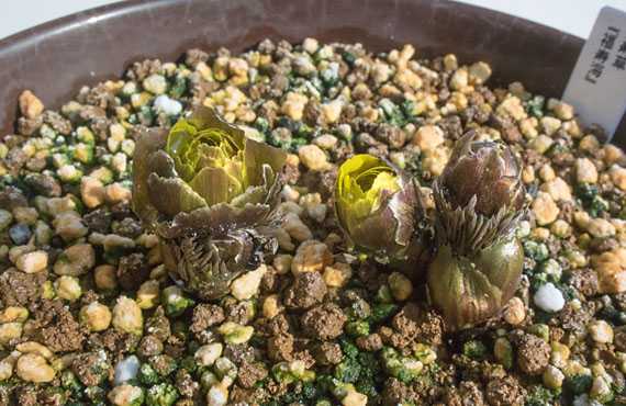 ホウチャクソウ(宝鐸草)もおデコを出してしまいました。通常なら3月に入ってこの状態になり、4月下旬に花を咲かせるのですが、今年は何があったのか、1ヶ月も早く動いてしまいました。昨年10月初め、秋の手入れで植替えを行った際には、冬芽の先端が0.5~1cmになる様に覆土していたので、自発的におデコをもたげたのは間違いありません。 第一級の寒い冬に、それも寒の谷底に当たるこの時期に頭を出すなど正気の沙汰ではありません。できるものなら、亀が首を引っ込める様に「地中に戻れ」と説教したいところですが、そうもいかないので成り行きに任せる外はありません。何とか凍傷に掛からない様祈るばかりです。