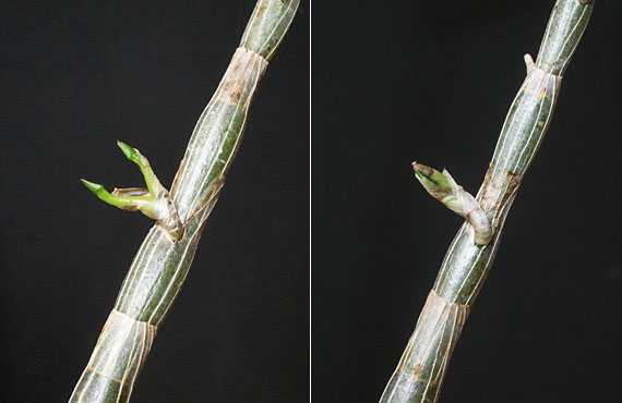 屋内に収容していたセッコク「雷山」の茎に、12月頃から米粒の半分ほどのコブができ始めていました。ツボミの初期の様子か・・・などと漠然と考えていたのですが、ここに来てグングン大きくなり始めて、それに伴ってツボミとは違う特徴を見せ始めました。それが上の画像なのですが、先端に葉っぱの様なものが現れて、どうやらこれは分身らしいことに気付いた次第です。 2日前に取り上げた同じ「雷山」の分身も、昨年夏にこれと同じプロセスで親離れしたものでした。その時はずいぶん大きくなって、分岐点付近から根が伸び始めて気付いたのですが、この分身もやがて根が出て、親株から切り離される形で独立していくものと推測されます。こんな分身が大小合わせて10個ほど存在しますが、全て独立に成功する様なら、増殖率はすごいことになりそうです。