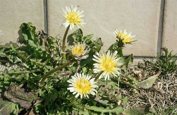 この半月余り、寒さに耐えて身を縮めていた白花タンポポが、申し合わせた様に一斉に開花してしまいました。画像の群落の他に、1mほど離れた場所でも4輪が開花しています。まだ本格的な開花時期ではありませんが、身を縮めていたものが、少しだけ寒気が緩んだのを逃さず、取り敢えず開花してみたら、他にもチャンスを待っていたものがたくさんいた・・・というのが、今回の大量開花の真相ではないかと見ています。向う1週間ほどは暖かい日が続く様なので、この品種の他にも、「試しに一咲き」してみようとする品種が現れるかもしれません。