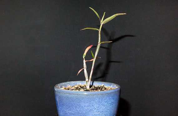 1ヶ月半ほど前、赤花セッコク「雷山」の屋内退避株の様子を紹介しました。紹介当時は脇芽の茎丈は3cmほどでしたが、今では8.5cm(葉っぱを除く)まで成長しました。丈はぐんぐん伸びましたが、胴回りは部分的に大きいところもあるものの、全体としては痩せ型体形です。暖かくなって幾らかでも太れたらいいのですが、このままでは将来の花付きにも影響しないか余計な心配をしてしまいます。 一方、兄貴分に当たる左の株は3.5cmのままで変化なしです。同じ環境なのに弟分を葉っぱを増やしたのに対して、兄貴分は葉を枯らせてしまいました。暖かくなれば復活するとは思いますが、こうした落葉が葉っぱの寿命によるのか、それとも他に何か原因があるのか気になるところです。