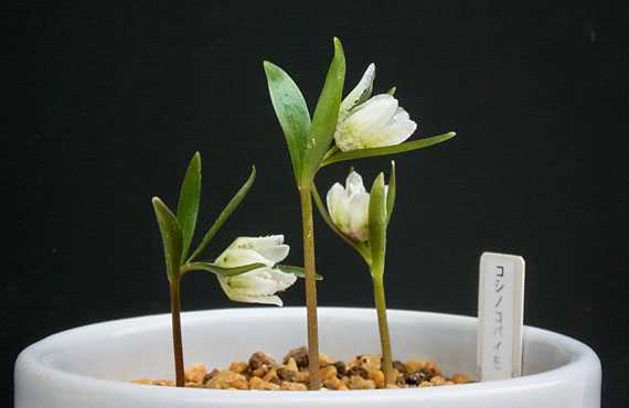 コシノコバイモが開花して5日経ちました。1番花開花当日には、花は開いてみたものの、花茎が甚だしく寸足らずで、まるで地面に生首を置いた様な姿でした。それがこの5日間で、開花済みの株も、未開花だった株も目覚ましい勢いで茎を伸ばしただけでなく、後を追っていた2株も開花してしまいました。 画像は昨日昼時点の様子です。左の個体が先頭切って開花した個体で、丈としては一番低身長ではありますが、この品種の平均的な草丈に照らして下限に近いながら、分布の範囲です。正しい姿勢としては、花が90度よりやや深く頭を垂れた状態が理想なのですが、遅れて開花した2個体はまだ角度が未熟で、正しい姿勢を習得できるのは今週後半になろうかと思います。何はともあれ、容姿や姿勢の難点がほぼ改善出来たことは「メデタシ!! 」の一語に尽きます。