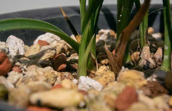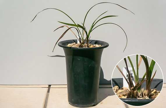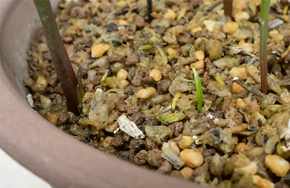 日本シュンランの「天紅香」は今年も作落ちしてしまいました。それも「やむなし」と言わざるを得ないほど、株立ちは貧弱になっています。例えば株元を少し拡大してみると、円内の様に、ザッと半分ほどが枯れてしまい、このポットに於いては新子による世代交代が停滞している様子が見て取れます。今回はこうした枯れたバルブを切除し、用土も新しいものに更新して、世代交代を促進させる環境を実現することにしました。 作業内容はすこぶる単純で、①枯れてしまったり、著しく健康状態の良くないバルブを切除し、②新しい用土で植え直す・・・これだけです。まず①については、完全に枯れたバルブ2点と葉っぱ1枚だけまで弱体化したバルブ1点を切り取りました。続いて②については、保水性を向上させる様、赤玉土と鹿沼土の配合比を幾分上げた用土で植付けました。こちらが植替えを済ませた様子です。今年1年はリハビリ期間として、株立ちの強化を進めることを目指します。