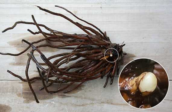 3月初めに新潟市まで花苗リクルートに出掛けた際、雪割草5点の他に山野草を何点か仕込んでいました。その内の1つがこれ、福寿草「秩父紅」です。店舗に並んだ段階で、既に苗は青息吐息、疲労困憊といった有様で、無事に育つかどうかは、かなり否定的な風貌でした。その分、値札はディスカウントされていて、健康な個体の1/3ほどの値付けになっていました。で、次の春まで生き延びれば拾い物、ということで、リスクを承知で購入してしまいました。それから2ヶ月余り、茎は休眠入りを待たずに枯れてしまいました。この辺で、株の状態を確認して、賭けの勝敗を見極めよう、ということで、苗を掘り返して状態を判定することにしました。それが上画像です。 根の半分ほどは腐敗、炭化していましたが、これはかなり以前・・・ということは、購入以前からこの状態だったものと推測されます。店舗に並んだ状態で元気がなかったのはこのためだった様です。残る半分は健康色が維持されていて、その中核部には米粒大ですが新芽も生成されていました。これなら、僅かではありますがまだ復活の可能性は残っている筈、ということで、通常のポットに植え付けて次の春を待つことにしました。新居は5号の深型ポリ鉢です。コチラが植え付けを済ませた様子で、この状態で春をまつことにします。