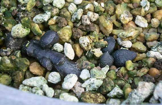 ユキワリイチゲは早々と休眠に入り、ポットは更地状態になってしまいました。そうしたポット表土のあちこちに、小は大豆粒から大は乾燥したマカロニほどの黒い物体が顔を出して来ました。ユキワリイチゲのファミリー増殖手段の一つ、”むかご”です。このまま放置しておけば、夏の間に発根し、半年後には葉っぱを出しますが、今でさえ過密状態のポット(6号プラ鉢)は収拾が着かなくなってしまいます。ということで、これらの”むかご”の定住先は後で考えることにして、まずは採取することにしました。 画像の様に表土を蹴散らして、半ば露出しているものもありますが、多くはしおらしく地中に身を隠しています。そうした隠遁派も表土を数mmめくれば表に出てしまいます。それやこれやを見付け次第捕獲して集めたのがこちらです。昨年もこれに近いものが発生した筈で、ポット内は相当な”押し競饅頭”状態と推測されます。来季に向けての新芽が生成される前に・・・ということは今の内に、過密解消のための植え替えを行う必要がありそうです。