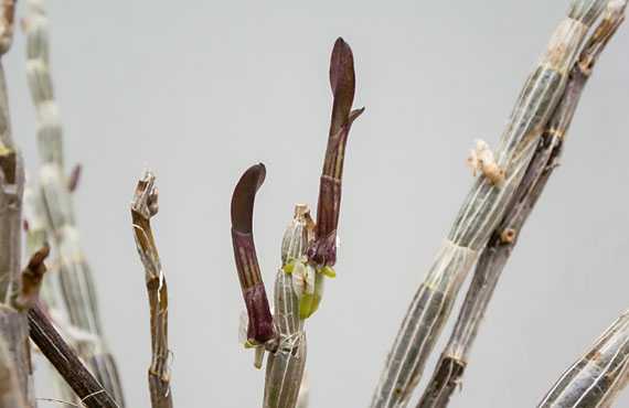 今回取り上げるのは、赤花セッコクの「雷山」です。最初に突起ができた頃にはツボミかと思っていたのですが、成長に伴い節が現れたり、葉っぱの様なものが現れたり、という具合に変貌し、遂には根の様なものが姿を見せるに及んで、これはファミリーの増殖だと結論付けるに至りました。今はまだ親株から養分は供給されていると思われますが、盛夏の頃には根もしっかり伸びて、自然に結合が取れて地面に落下する・・・という流れになる様です。運悪く天地逆さまに落下してしまうと「南無・・・」ということになるのでしょうが、茎が林立する様子を見る限り親株が老化して姿を消す以上に、無事に着地し定着する方の数が多いと見て良さそうです。それまでに葉っぱを再生したり、花を咲かせたり、と随分忙しい季節になる様ですが、節目ごとの振舞いをじっくり見届けてやろうと思っています。