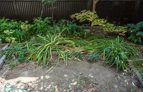 あと1ヶ月もすれば自然に葉を枯らせて束の間の休眠に入るリコリスですが、今は伸び放題に伸びた葉が半ば横倒し状態になって周辺に被さり、見かけ上繁茂する範囲が倍増したかの様な景観を実現しています。株元を掻き分けて内部を見ると、既に1/3ほどは枯れています。花後に葉を出してから7ヶ月、もう十分に光合成は足りただろう、という勝手な判断で、見苦しく繁茂する葉を、前倒しで刈り払おう、ということにして作業に取り掛かりました。 作業そのものは園芸バサミでチョキチョキ切り払うだけの簡単なものです。30分余りで全てを刈払い、刈り取った葉っぱをプチ菜園に穴を掘って埋めました。その様子が下の画像で、最下段の土壌が黒っぽい部分が葉っぱを埋めた場所です。梅雨入り頃には土に戻り、いい肥料になる筈です。