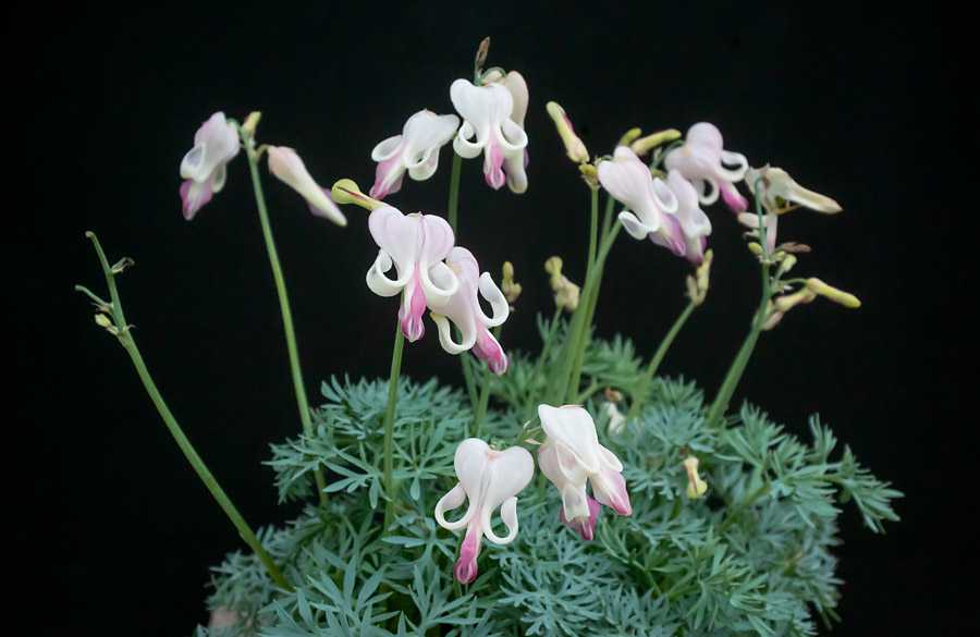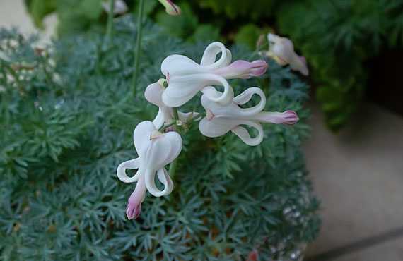 1番花の開花から1ヶ月を超えたコマクサの「丹頂」です。1番花は花弁全体が淡いピンクを帯びていて、嘴(くちばし)の赤の印象が薄められてしまい、少々ガッカリしたものでした。この”ガッカリ”感は、後続の花で次第に改善し、今咲いている花の花弁はカタログ通りの「白」で、紅一点の嘴の赤みを際立たせています。 それはそれとして、花のボリュームは今がピークといった印象で、ポット内を賑わせています。この賑わいぶりは期待を大きく超えるもので、久々にいい個体に当たった、という感覚を味わっています。未開花のツボミの他に、まだ葉っぱの塊から頭を出し切っていない花軸もあり、この先1週間か10日は楽しませて貰えそうです。 余談ですが、10日余り前に白花コマクサで種子が完熟し始めたことを紹介しました。こちら「丹頂」ではまだその様な気配は見せていませんが、もし結実する様なら、全力投球(?)で種子を採取して、増殖を試みるつもりです。